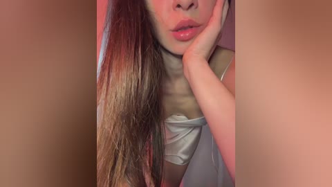 A close-up video of an Asian woman with fair skin, wearing a sheer white lace bra with thin straps, set against a pink-lit background. Her lips are slightly parted, and her long, straight hair cascades down her back.