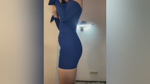 Video of a woman wearing a tight, black, lace-up mini dress with a keyhole cutout revealing her midriff. She stands in a dimly lit room with a white towel hanging nearby.