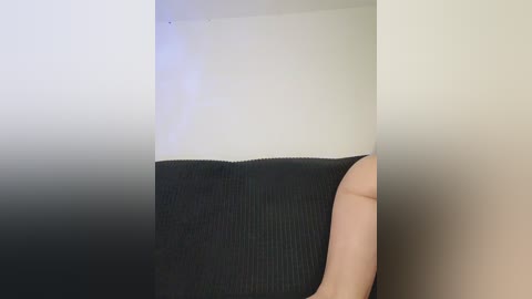 A color video of a nude woman with light skin, small breasts, and brown hair, lying on a black couch, spreading her legs and touching her vulva.