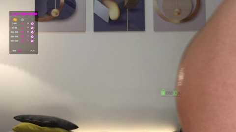 Video of a blonde woman in a white crop top and black thong, kneeling on a bed, in a modern bedroom with minimalist decor, three abstract paintings, and a digital clock.