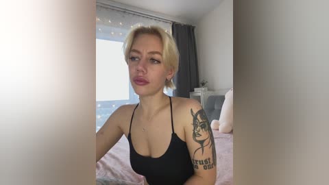 Video of a fair-skinned, blonde woman with short hair, wearing a black halter top, sitting on a bed in a softly lit room.